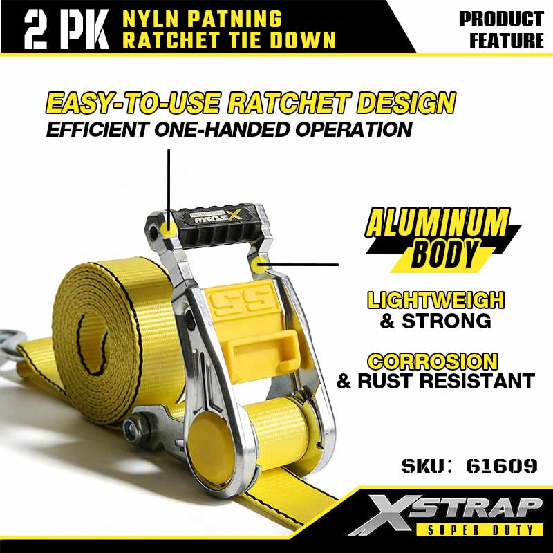 - Aluminum Body & Nylon Webbing:Ang ratchet ay may magaan na aluminum na katawan na lumalaban sa kalawang at kaagnasan. Ang makapal na nylon webbing ay gumagamit ng heavy duty stitching upang maiwasan ang pagkapunit. Ito ay humahawak sa ulan ng araw at magaspang na panginginig ng boses.