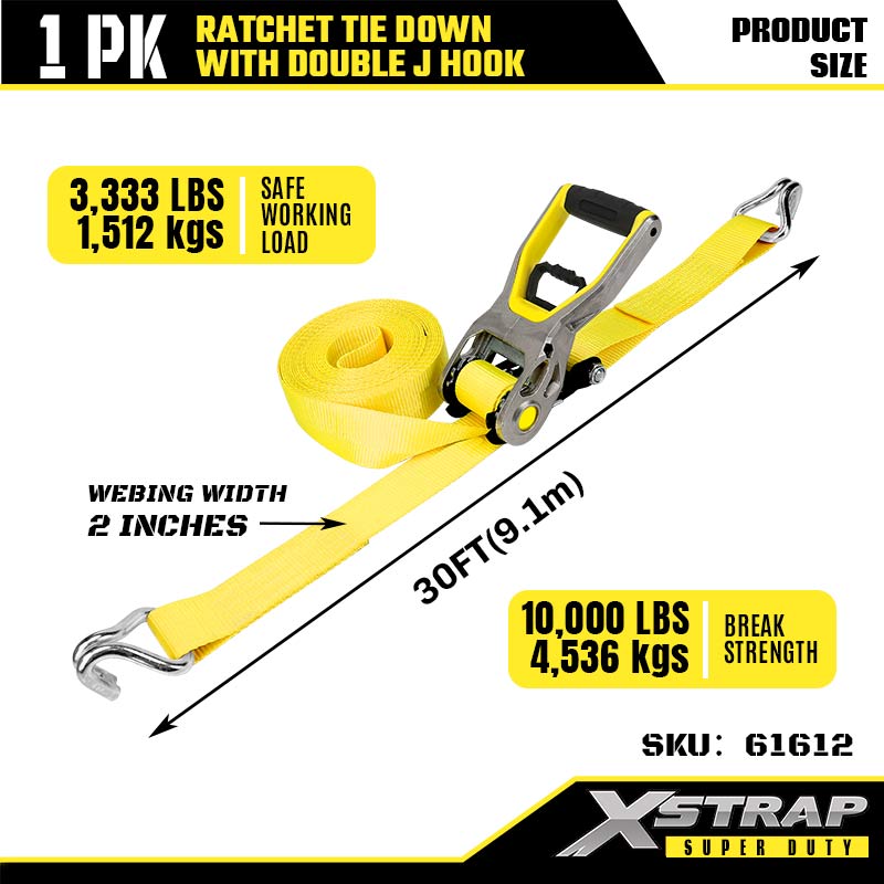 Xstrap 2PK Ratcet Tie Down na may Double J Hooks, 2” x 30’ Polyester Tie Down Strap Ratchet Strap, 3333lbs Kapasidad Cargo Lashing Securing Straps na may Double J Hooks para sa Heavy Duty Trailer, Flat Bed Trailer Ski Boat, Maliit na Kotse, Mabigat na Kagamitan.
