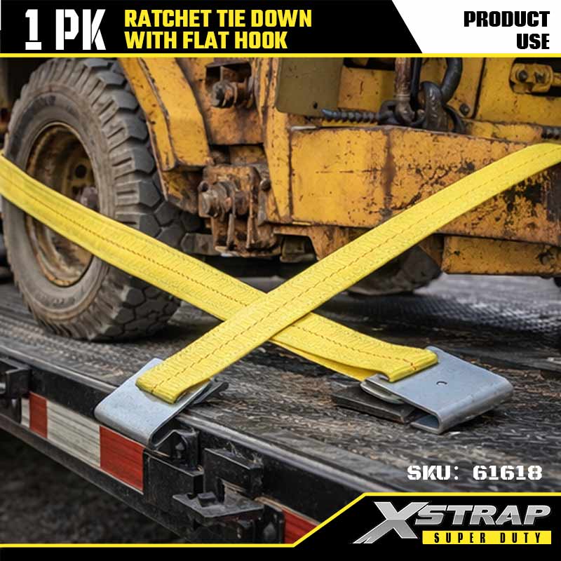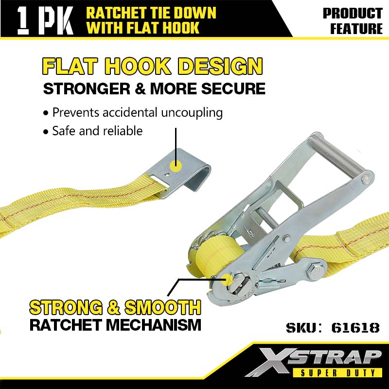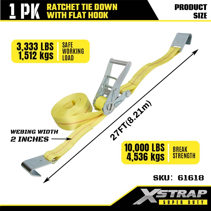 Xstrap Ratcet Tie Down na may Flat Hooks, 2” x 27’ Polyester Tie Down Strap Ratchet Strap, 3333lbs Kapasidad Cargo Lashing Securing Straps na may Flat Hooks para sa Heavy Duty Trailer, Flat Bed Trailer Ski Boat, Maliit na Kotse, Mabibigat na Kagamitan.