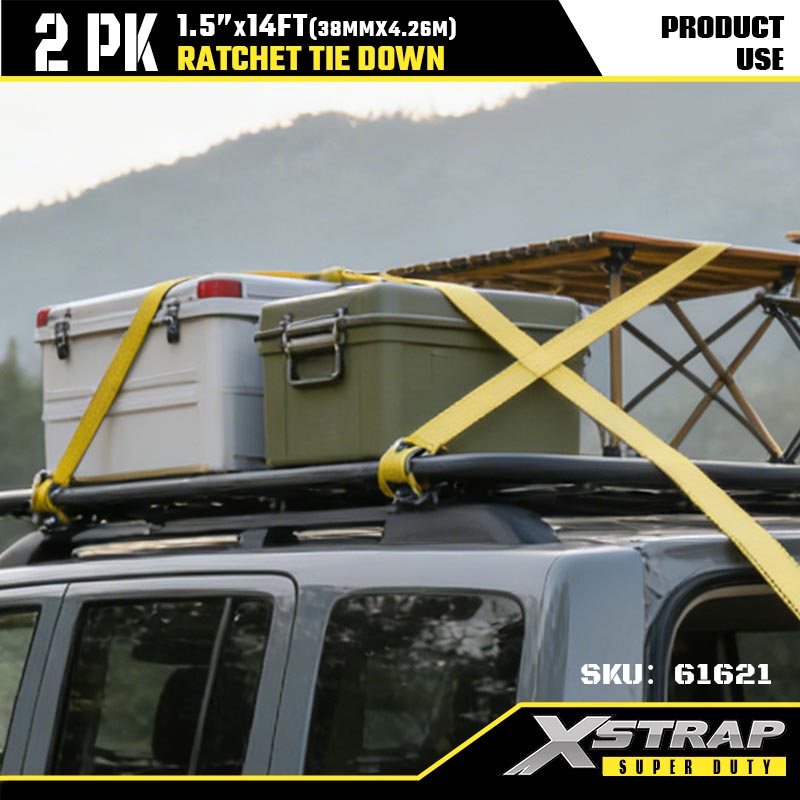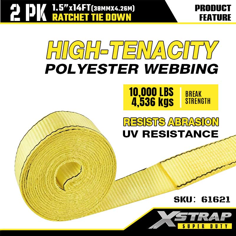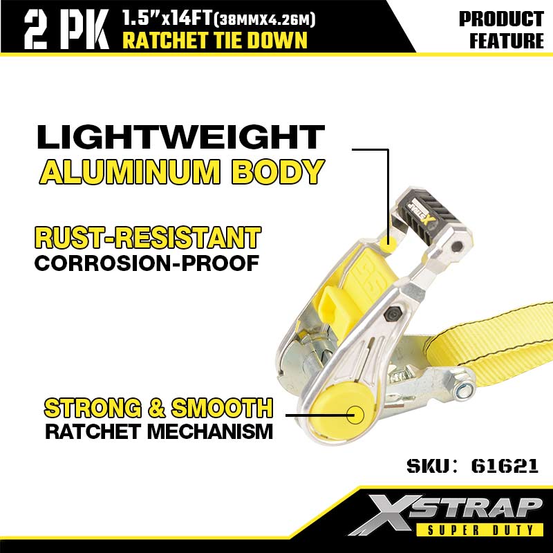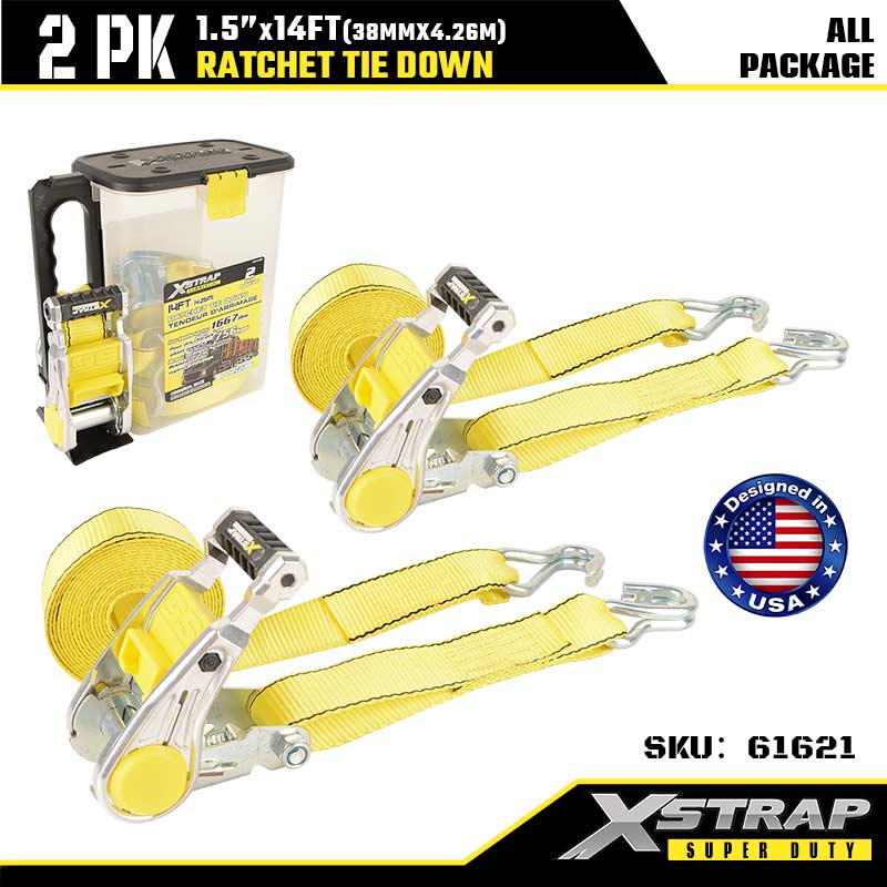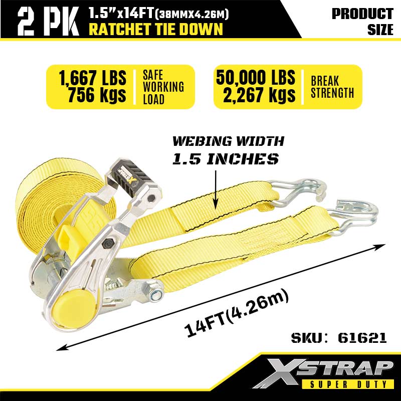 Xstrap 2PK Ratcet Tie Down na may Double J Hooks, 1-1/2” x 14’ Polyester Tie Down Strap Ratchet Strap, 1667lbs Kapasidad Cargo Lashing Securing Straps na may Double J Hooks para sa Heavy Duty Trailer, Flat Bed Trailer Ski Boat, Maliit na Kotse, Mabigat na Kagamitan.
